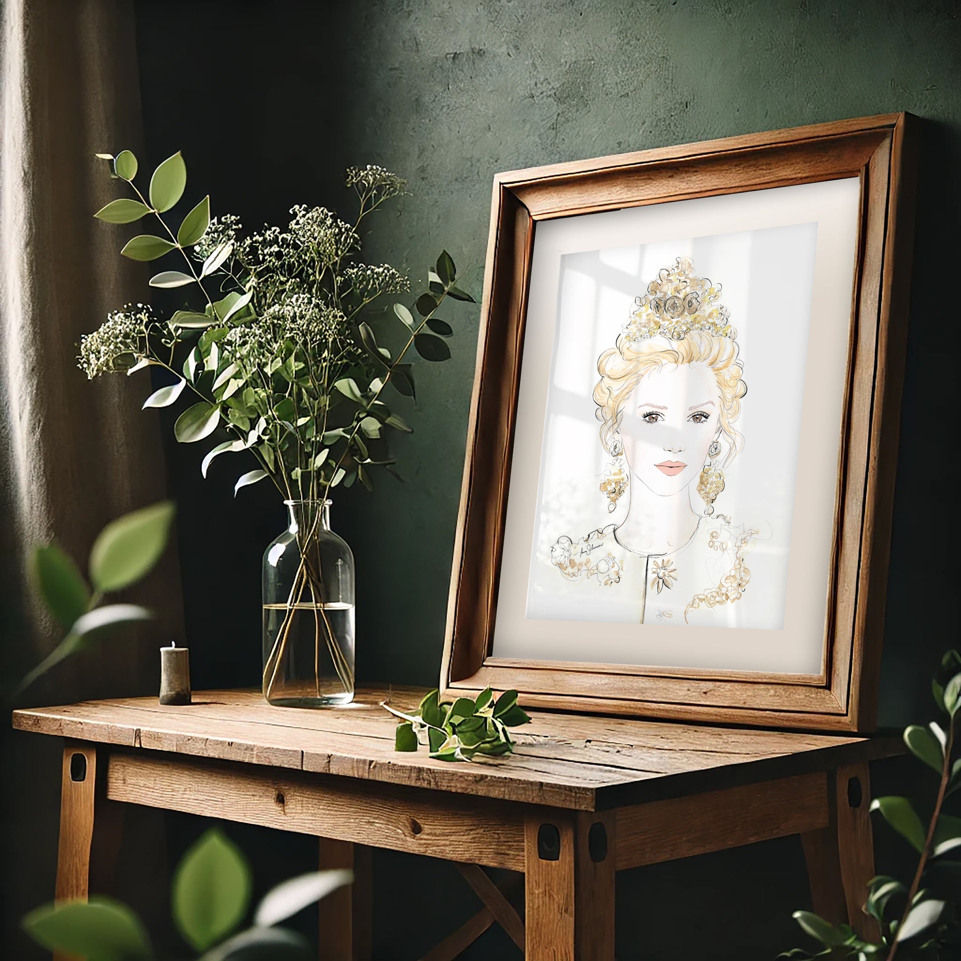This delicate and elegant print will give your home an luxurious and artistic touch. It shows a blonde fashion model wearing a golden headpiece and earrings as well as en embellished dress. This fashion art piece was created in a very feminine and delicate style.