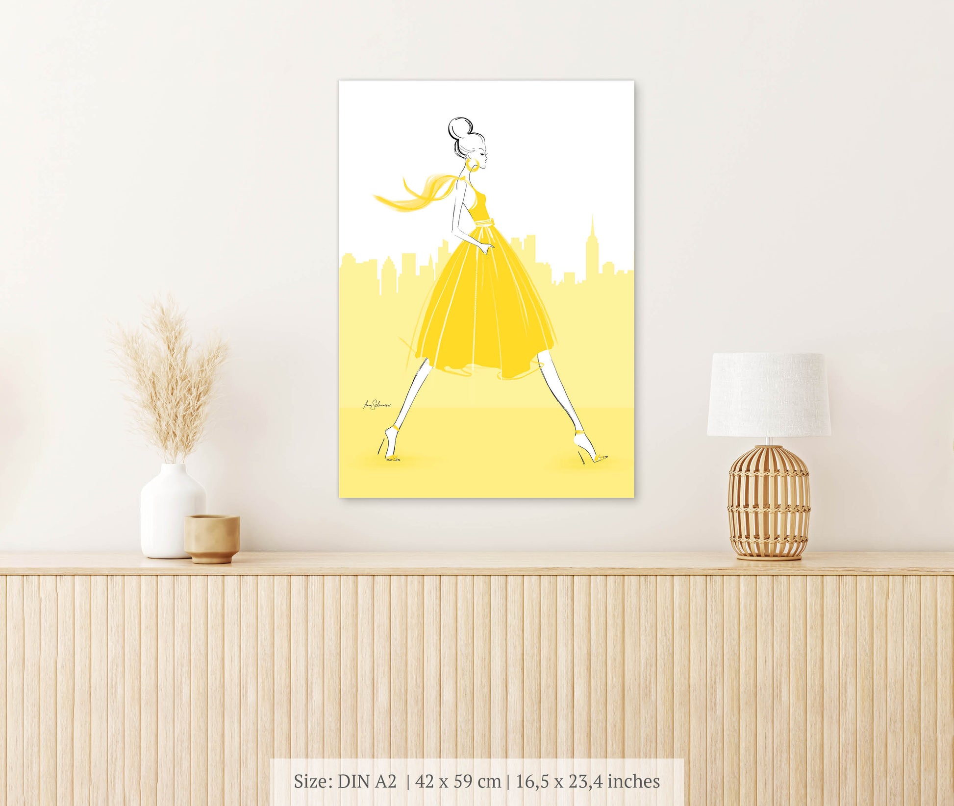 This vivid print will give your home a colorful and artistic touch. It shows a moody fashion girl walking in front of a New York Skyline in yellow. It´s a cute fashion illustration. This elegant art print was created with a very feminine and delicate style.