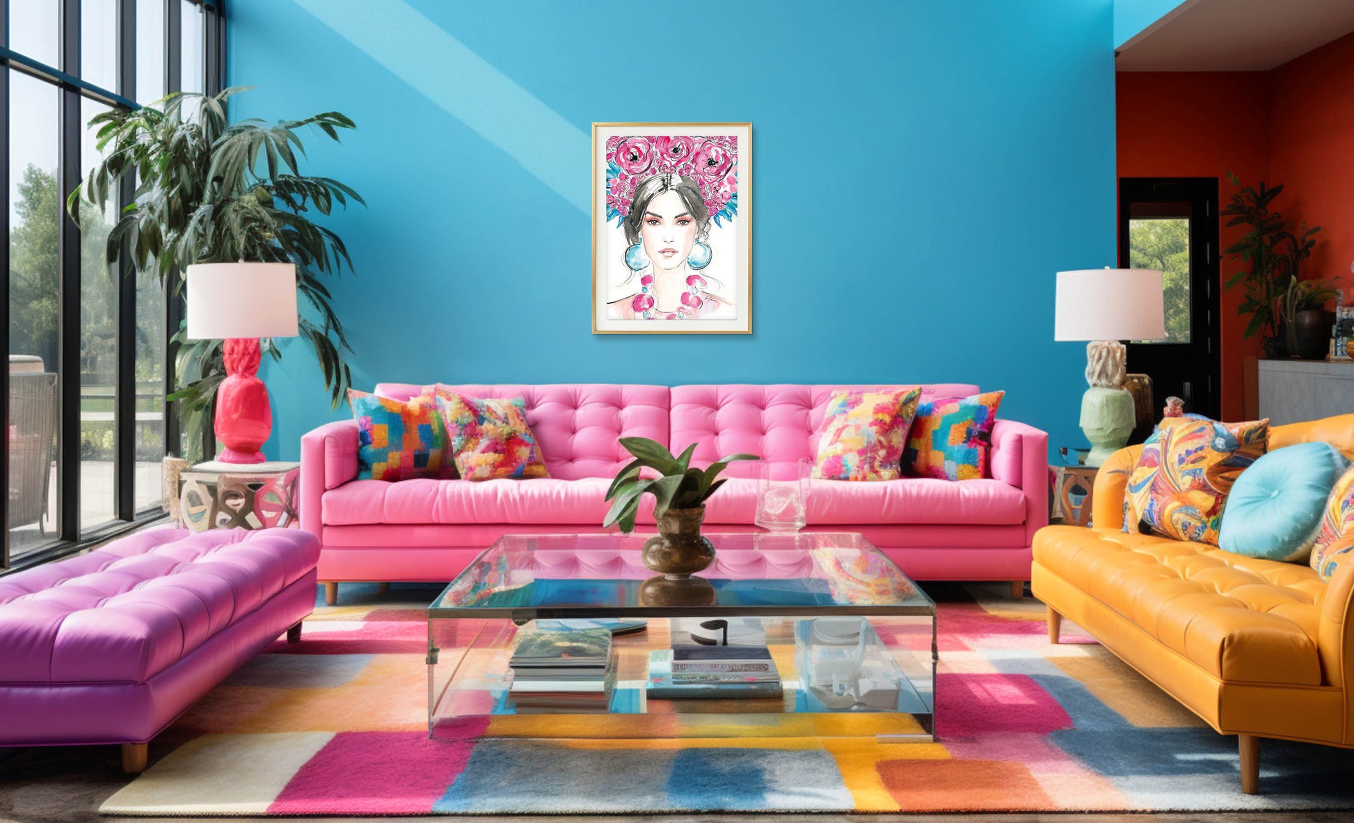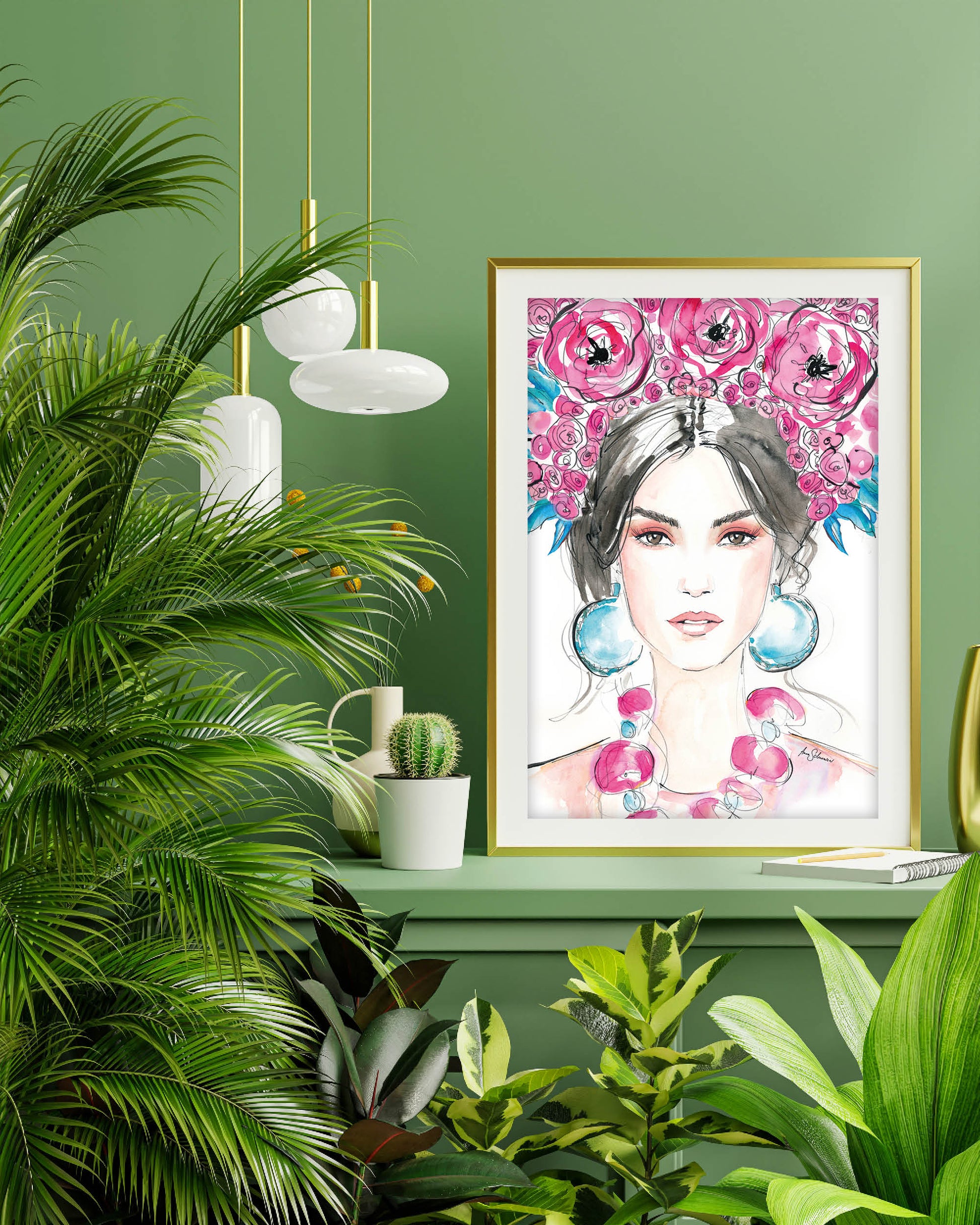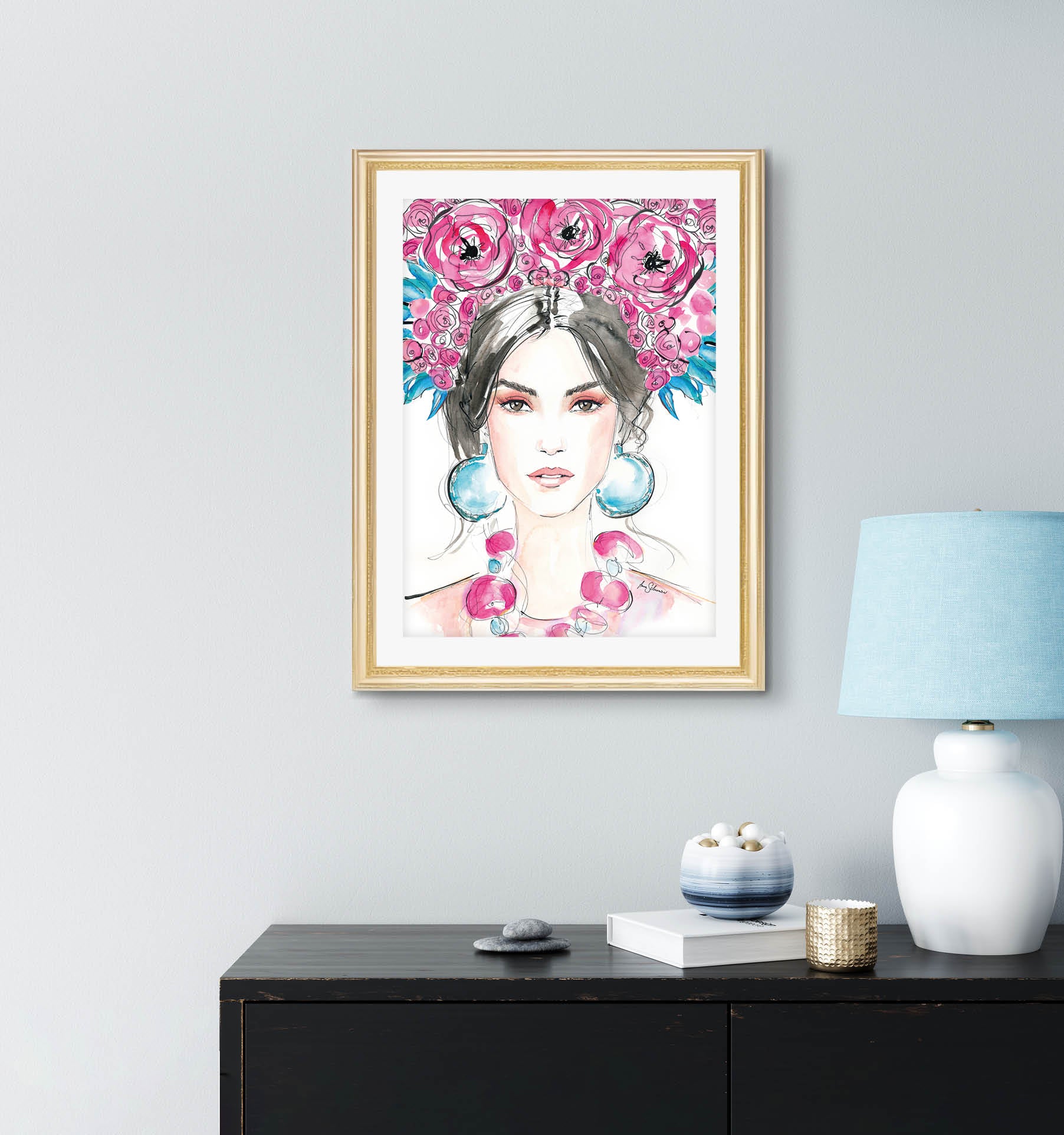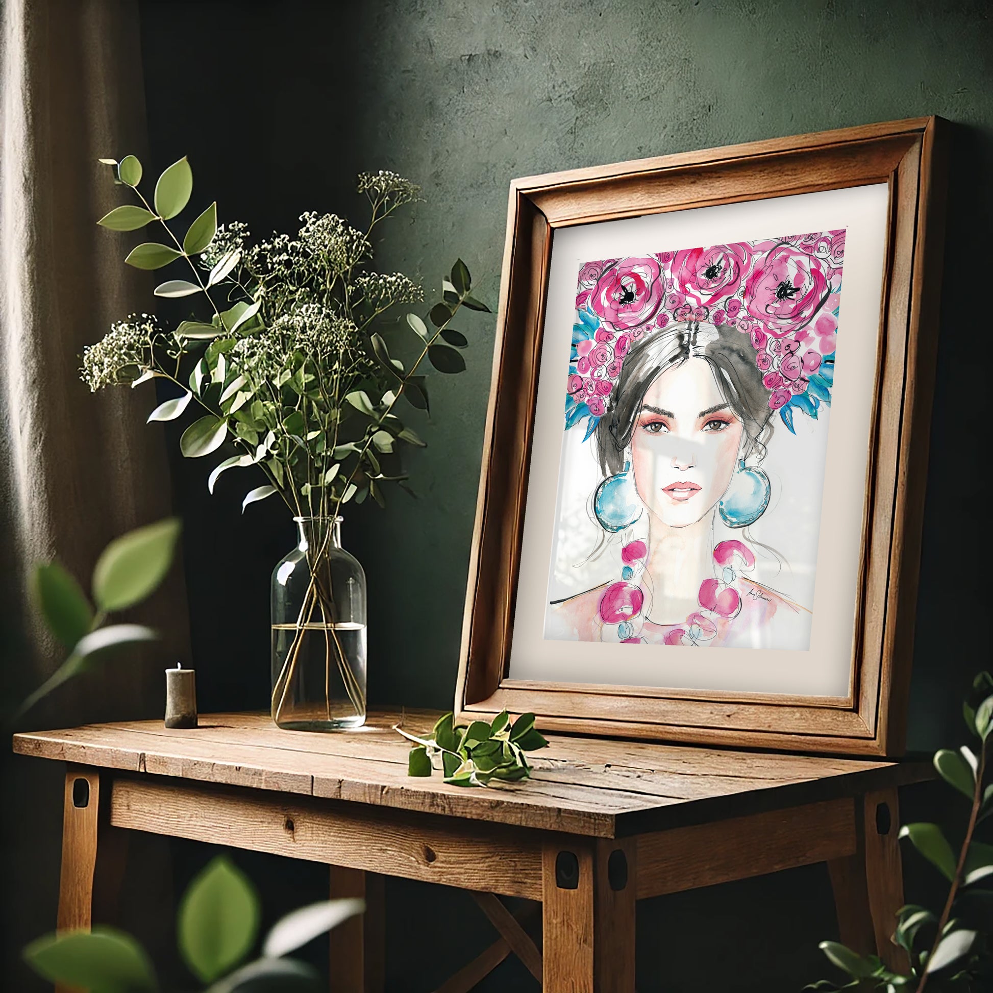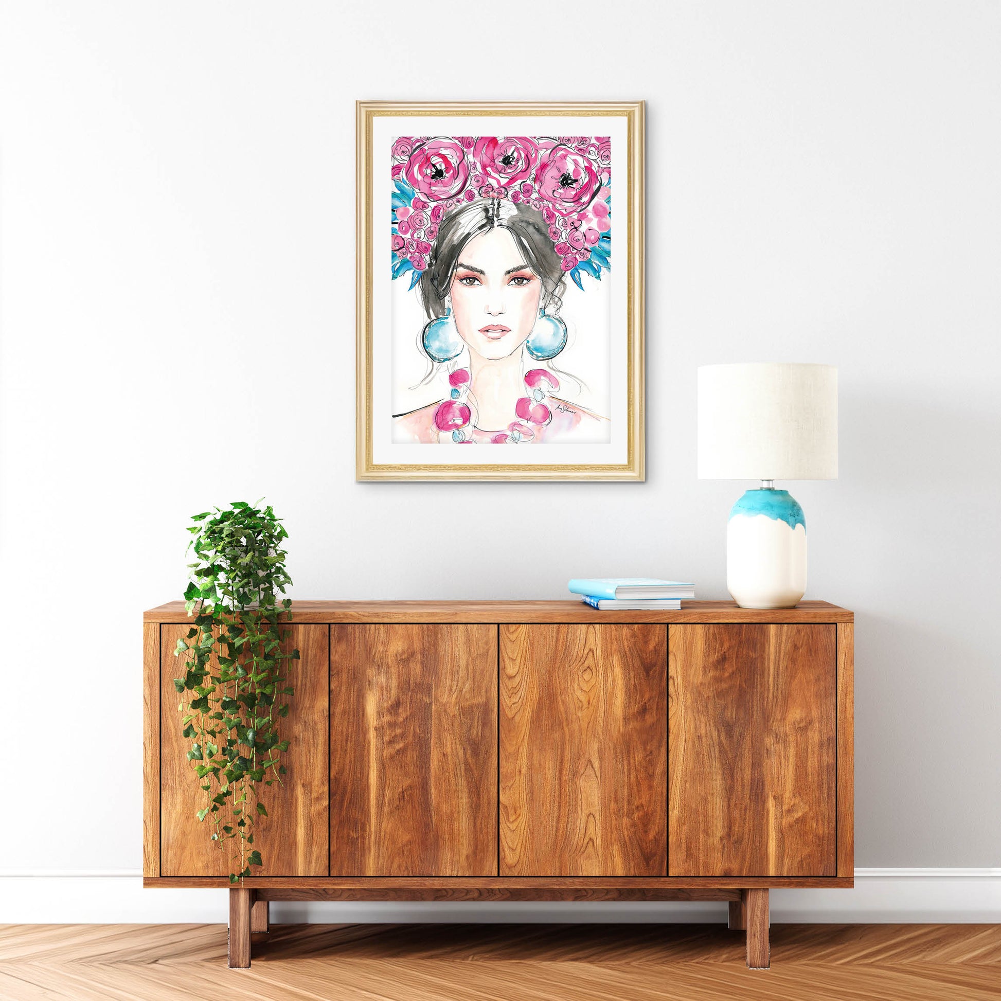 This vivid print will give your home a colorful and artistic touch. It shows a brunette fashion model wearing a colorful floral headpiece (a flower crown) along with bold earrings and a necklace. It´s an elegant fashion illustration – or rather a style portrait. It is an elegant fashion art piece that is created with a very feminine and delicate style.
